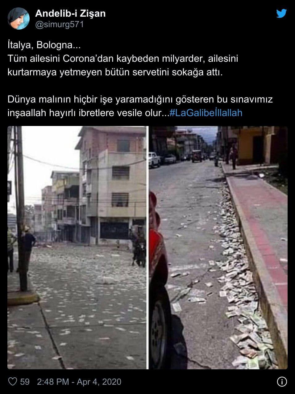 “İtalya, Bologna… Tüm ailesini Corona’dan kaybeden milyarder, ailesini kurtarmaya yetmeyen bütün servetini sokağa attı. Dünya malının hiçbir işe yaramadığını gösteren bu sınavımız inşaallah hayırlı ibretlere vesile olur…”