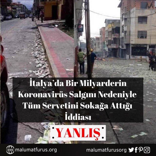 İtalya’nın Bologna şehrinde bir zenginin koronavirüs karşısında bir işe yaramadığı için tüm servetini sokaklara döktüğü iddiasıyla paylaşılan görseller Venezüela’dan. Paylaşılan fotoğrafların koronavirüs salgınıyla bir ilgisi bulunmuyor. Yerlere saçılmış banknotlara ait görseller 2019 yılı Mart ayında Venezüela’nın Merida adlı kasabasında yaşanan banka yağmasının ardından çekilmiş. Yerlerde görülen banknotlar 2008 yılı Ağustos ayında yeni bir para birimi bolivar soberano ile değiştirilen ve 5 Aralık 2018’den sonra herhangi bir geçerliliği kalmayan Venezuela’nın eski para birimi olan bolivar fuertedir.