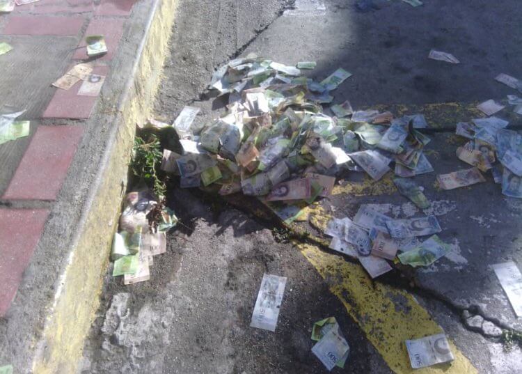 Yerler esaçılmış banknotlara ait görseller 2019 yılı Mart ayında Venezüela’nın Merida adlı kasabasında yaşanan banka yağmasının ardından çekilmiş.