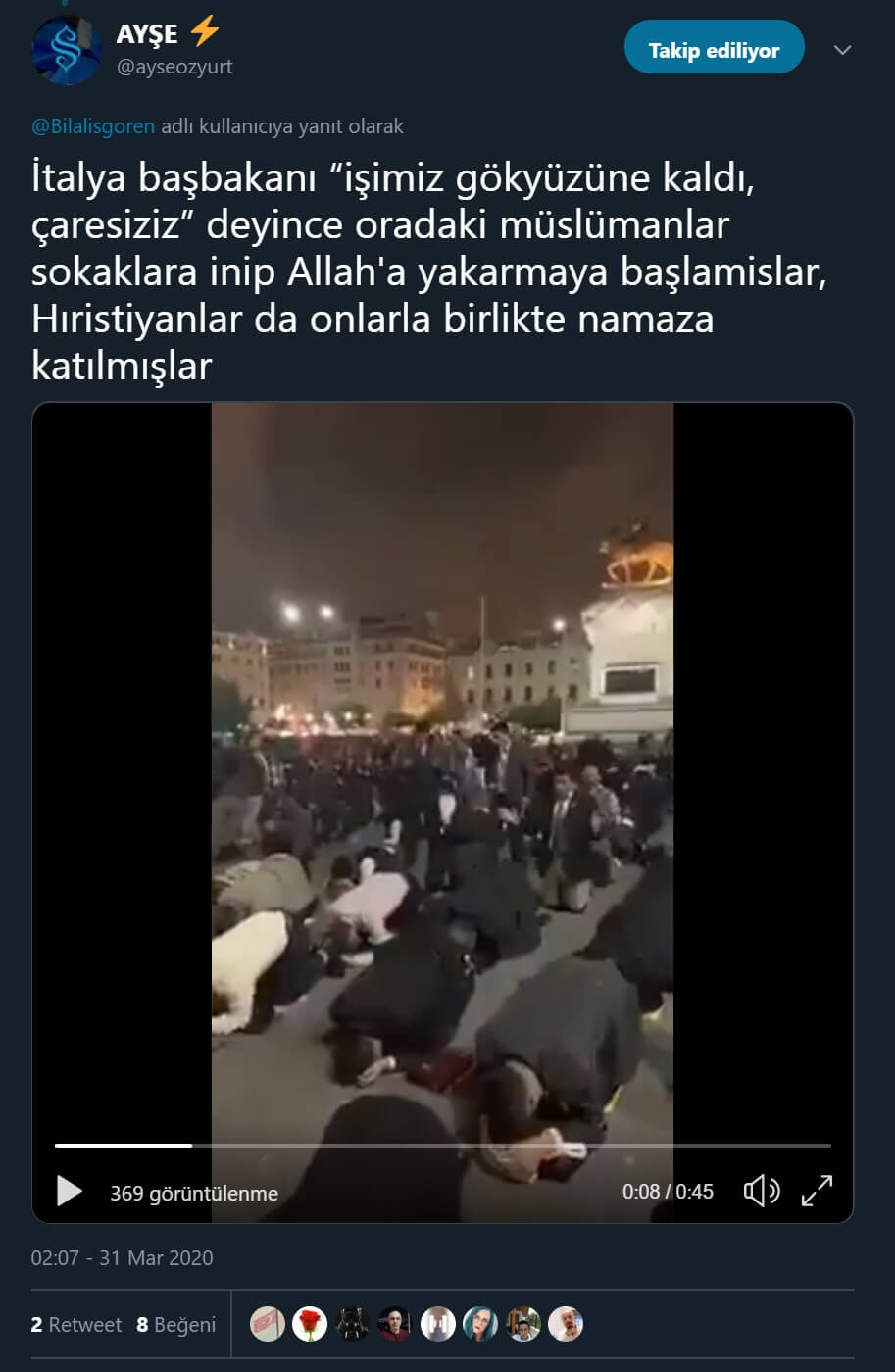 Benzer şekilde koronavirüs salgını nedeniyle oluşan vakaların ve yaşamını yitiren kişilerin sayısının oldukça yüksek seyrettiği İtalya’da Hristiyan halkın Müslümanlarla birlikte namaz kıldığı ve secdeye kapandığı iddiasıyla bir video daha sosyal medyada paylaşılmaya başlandı.