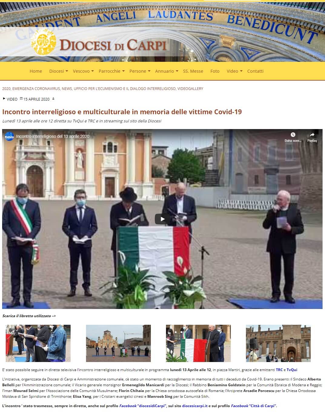 Paylaşılan görüntü İtalya’nın Carpi adlı şehrinde 13 Nisan 2020 tarihinde Carpi Piskoposluğu (Diocesi Di Carpi) ve Carpi Belediye İdaresi tarafından Martiri Meydanı’nda (Piazza Martiri) düzenlenen “Covid-19 kurbanlarının anısına dinler arası ve çok kültürlü toplantı” (“Incontro interreligioso e multiculturale in memoria delle vittime Covid-19“) adlı etkinlikten.