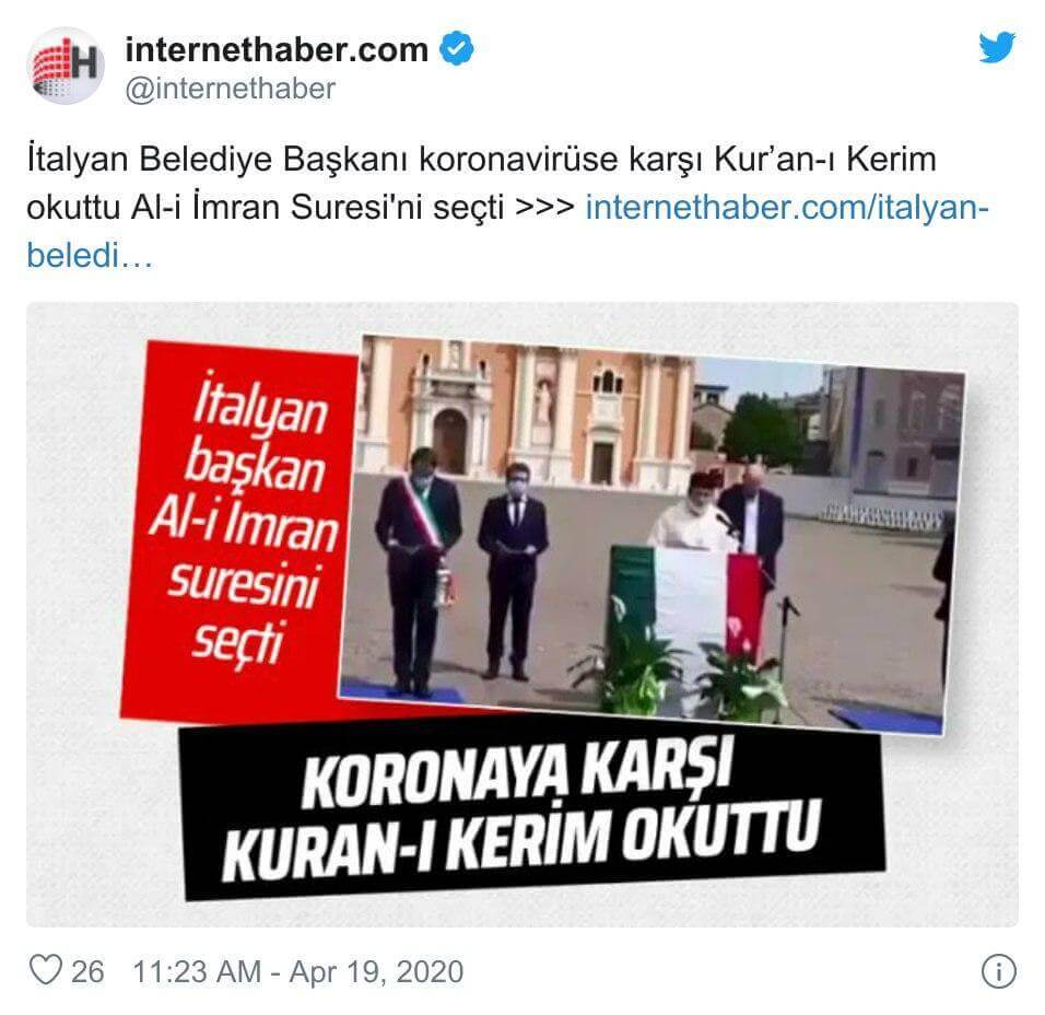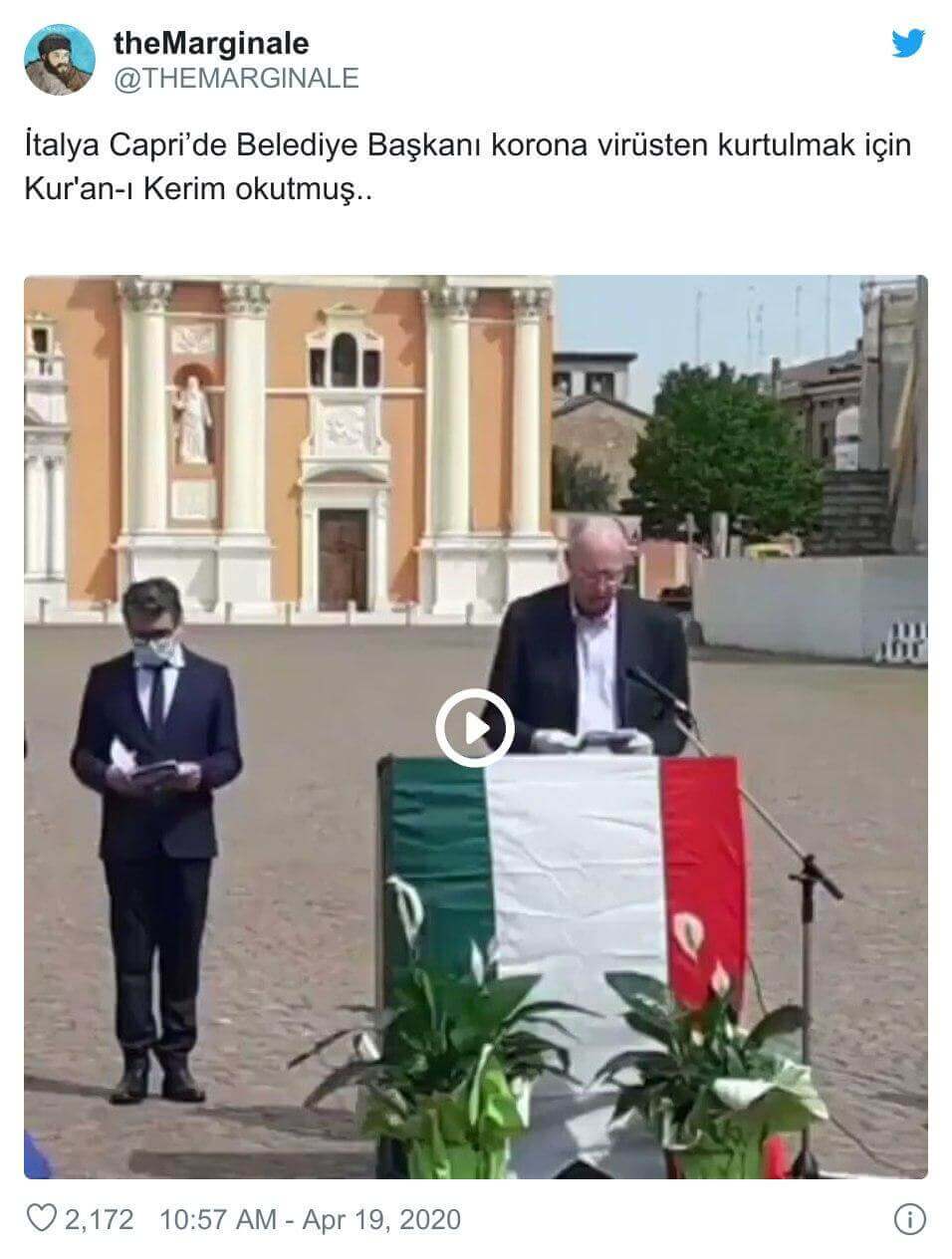 “İtalyan Belediye Başkanı koronavirüse karşı Kur’an-ı Kerim okuttu Al-i İmran Suresi’ni seçti” ve “İtalya Capri’de Belediye Başkanı korona virüsten kurtulmak için Kur’an-ı Kerim okutmuş” söylemlerini içeren paylaşımlardan bazıları şöyleydi: