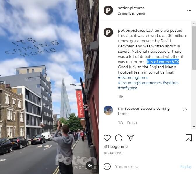 Potion Pictures, hazırladıkları “RAF100 flypast video” olarak nitelenen görüntünün 30 milyon görüntülenme aldığını, David Beckham dahil olmak üzere birçok ünlü tarafından paylaşıldığını, ulusal çapta gazetelerde konu edildiğini belirttikleri videonun “ELBETTE VFX” (“it is of course VFX”) olduğunu aktardı.