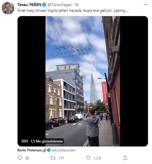 Söz konusu video Türkiye’den (Tansu Yeğen gibi) sosyal medya kullanıcıları tarafından da gerçek sanılarak “Final maçı öncesi İngiliz jetleri havada ‘kupa eve geliyor’ yazmış…” notuyla sosyal medyada paylaşılmıştı (Görülen uçakların jet değil 2. Dünya Savaşı döneminde kullanılan Spitfire adlı pervaneli uçak olduğunu da not düşmüş olalım):