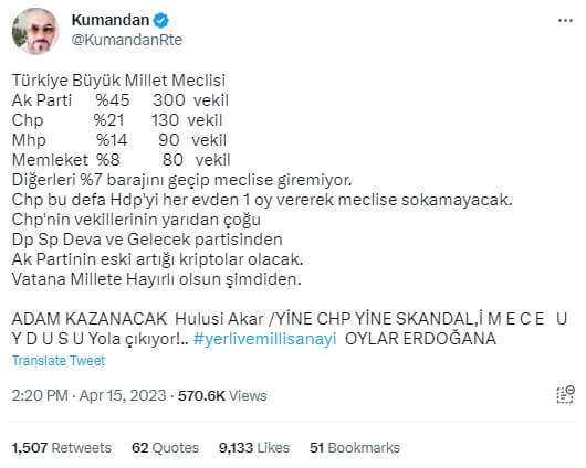 “Türkiye Büyük Millet MeclisiAk Parti %45 300 vekilChp %21 130 vekilMhp %14 90 vekilMemleket %8 80 vekilDiğerleri %7 barajını geçip meclise giremiyor.Chp bu defa Hdp’yi her evden 1 oy vererek meclise sokamayacak.Chp’nin vekillerinin yarıdan çoğuDp Sp Deva ve Gelecek partisindenAk Partinin eski artığı kriptolar olacak.Vatana Millete Hayırlı olsun şimdiden.”