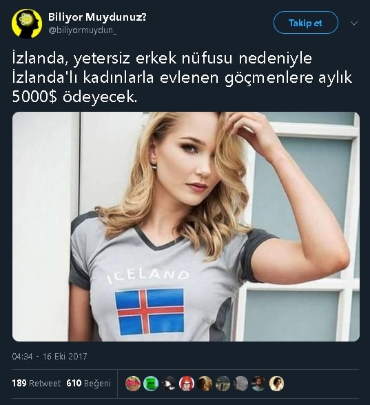 İzlanda nüfusundaki kadınların erkeklere kıyasla fazla sayısını dengelemek maksadıyla İzlanda hükümetinin İzlandalı kadınla evlenecek her bir göçmene 5000 ABD doları ödeme yapacağı, önceliğin Kuzey Afrika bölgesinden göçmenlere verileceği yönünde bir iddia sosyal medyada bir hayli dikkat çekmişti.