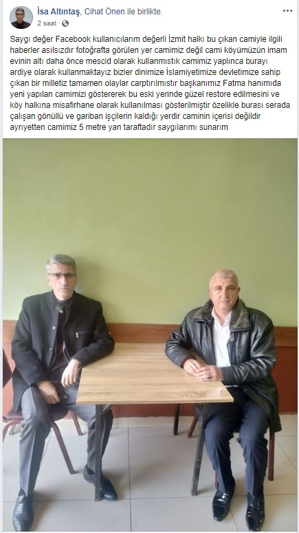 İzmit Fethiye Köyü Muhtarı İsa Altıntaş da camiye ayakkabıyla girildiği iddiasının asılsız olduğunu, fotoğrafta görülen yerin eskiden mescit olarak kullanılan, imam evinin altı olduğunu, cami yapılınca buranın ardiye olarak kullanıldığını belirtmişti. Muhtarı İsa Altıntaş, camiye ayakkabıyla girildiği iddialarını “Fotoğrafta görülen yer camimiz değil cami köyümüzün imam evinin altı daha önce Mescit olarak kullanmıştık camimiz yapılınca burayı ardiye olarak kullanmaktayız” ve “Bizler dinimize İslamiyetimize devletimize sahip çıkan bir milletiz tamamen olaylar çarptırılmıştır” sözleriyle yalanlamıştı.