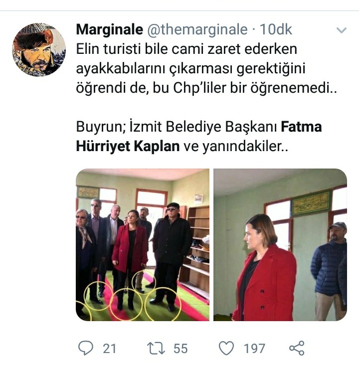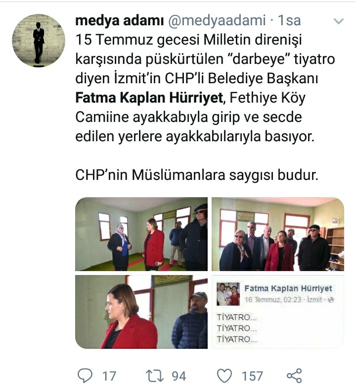 Gezi Parkı eylemleri sırasında camide içki içildiği iddiasını herkes hatırlayacaktır. Bu asılsız iddiaya benzer şekilde bu defa sosyal medyaya camiye ayakkabıyla girildiği yönünde bir iddia servis edildi. İddiaya göre, CHP’li İzmit Belediye Başkanı Fatma Kaplan Hürriyet’in ve beraberindekiler, Fethiye Köyü’ndeki camiye ayakkabıyla girmişlerdi..