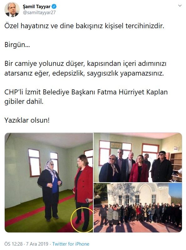 Şamil Tayyar, CHP’li İzmit Belediye Başkanı Fatma Kaplan Hürriyet’in ve beraberindekilerin camiye ayakkabıyla girdiğini sosyal medya hesabından yaptığı bir paylaşımda ileri sürmüştü (Paylaşımını daha sonra silmişti).