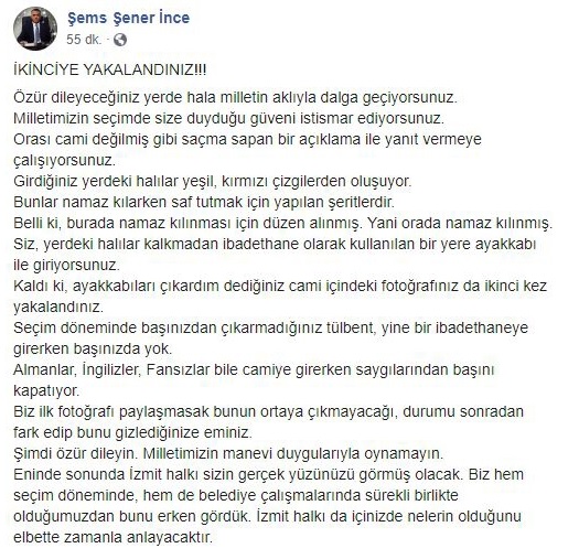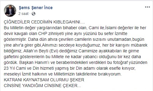 Başkan Fatma Kaplan Hürriyet, ilk olarak AK Parti İzmit Belediyesi Meclis Üyesi Şener İnce’nin bu iddiayı ortaya attığını belirtmişti. Şems Şener İnce’nin paylaşımına dair ekran görüntüsü bu iddiayı doğruluyor.