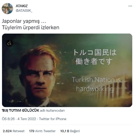 “Japonların, Türk ulusal kurtuluş mücadelesini anlatan videosu sosyal medyanın gündemine oturdu. Japonca ile animasyon görüntüler içeren, Sevr ile başlayan ve Kurtuluş Savaşı’na giden yolu anlatan videoda yine Japonca İzmir Marşı seslendirilmesi büyük ilgi uyandırdı.”