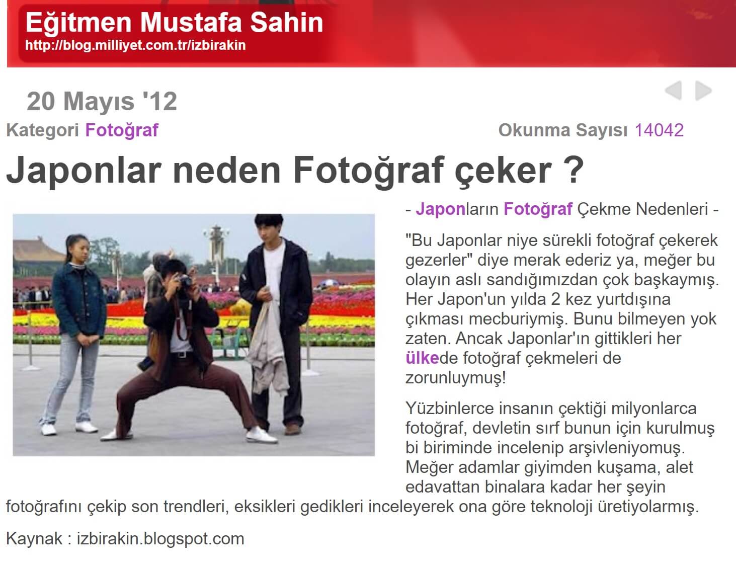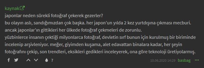 “Japonların Fotoğraf Çekme Nedenleri“Bu Japonlar niye sürekli fotoğraf çekerek gezerler” diye merak ederiz ya, meğer bu olayın aslı sandığımızdan çok başkaymış. Her Japon’un yılda 2 kez yurtdışına çıkması mecburiymiş. Bunu bilmeyen yok zaten. Ancak Japonlar’ın gittikleri her ülkede fotoğraf çekmeleri de zorunluymuş!Yüzbinlerce insanın çektiği milyonlarca fotoğraf, devletin sırf bunun için kurulmuş bi biriminde incelenip arşivleniyomuş. Meğer adamlar giyimden kuşama, alet edavattan binalara kadar her şeyin fotoğrafını çekip son trendleri, eksikleri gedikleri inceleyerek ona göre teknoloji üretiyolarmış.”