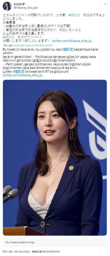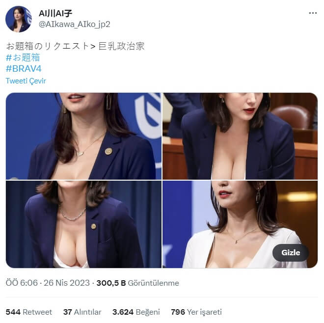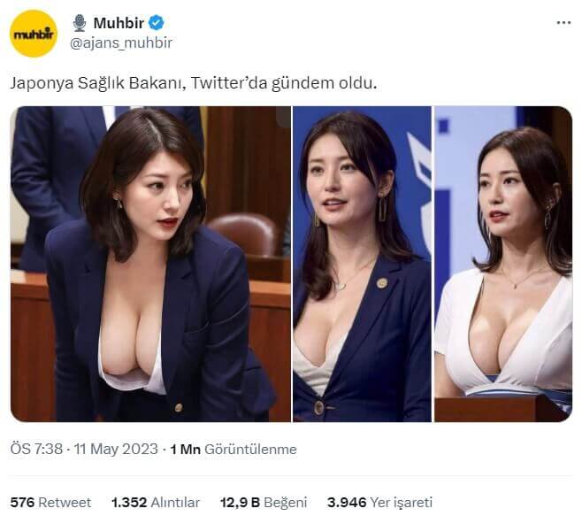 Bahsi geçen profil, Japonya Sağlık Bakanına ait sanılan söz konusu dekolteli görselleri “politikacıya benzeyen güzel bir yapay zeka kadınının görüntüsü (göğüs büyüklüğü önemsizdir)” notuyla aktarmış.