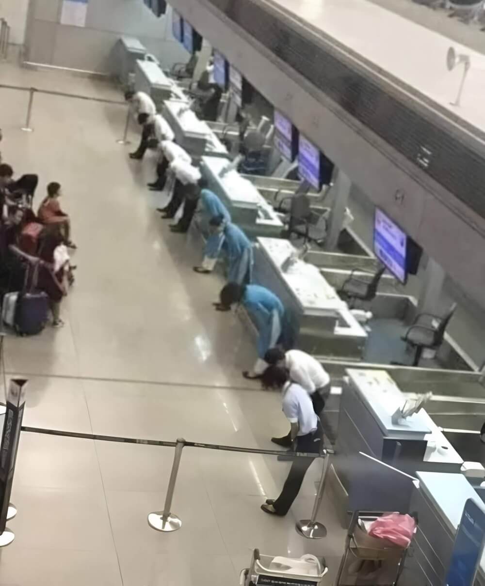 Örneğin, Japonya’da bir uçuş veya tren geciktiğinde, havalimanları ve istasyonlardaki tüm çalışanlar topluca yolculardan özür dilediği iddiasıyla paylaşılan görsel şu şekilde: