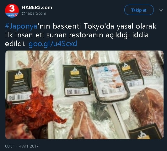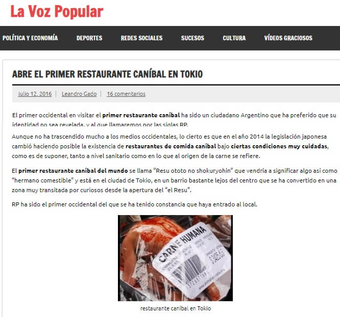 Ancak, bu kanibalizm iddiası her ne kadar birçok internet sitesi tarafından haberleştirilse de ve sosyal medyada bazı kullanıcılar tarafından gerçek sanılsa da doğruyu yansıtmıyor. Tokyo’da insan eti satan bir restoranın açıldığına yönelik iddiaların kaynağı İspanyolca sahte haber üreten La Voz adlı internet sitesinde 2016 Temmuz ayında yayınlanan bir parodi haber.