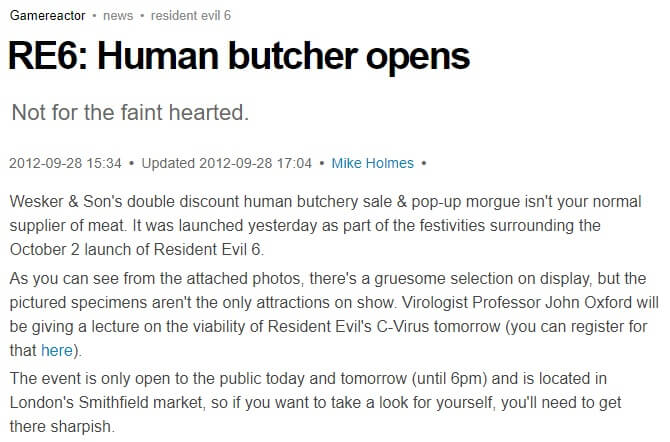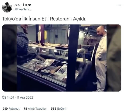 İLAVE: Parodi içerik üreten La Voz adlı internet sitesinin 2016 yılında 1 Nisan şakası amacıyla kurguladığı iddianın Resident Evil 6 adlı oyunun 2012 yılında Londra’daki tanıtımı için hazırlanan video ile birlikte “Tokyo’da İlk İnsan Et’i Restoran’ı Açıldı” notuyla paylaşıldığı görülüyor.