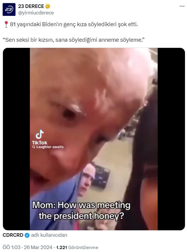 23 Derece (@yirmiucderece): “81 yaşındaki Biden’ın genç kıza söyledikleri şok etti. ‘Sen seksi bir kızsın, sana söylediğimi anneme söyleme.'”