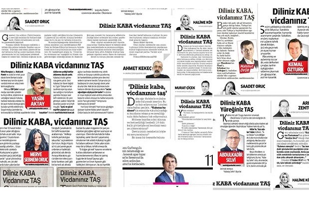2015 yılı Mart ayında gelindiğinde ise yine iktidara yakın basın organlarının köşe yazarları koro halinde “Diliniz kaba, vicdanını taş” ortak başlığını kullanarak Kabataş yalanının savunuculuğunu sürdürmüşlerdi (Abdülkadir Selvi tek kelimelik değişiklik yaparak, “Diliniz Kaba, yüreğiniz Taş” başlığını kullanmıştı). 5 Mart 2015 günü aynı başlığı atan bahse konu köşe yazarları şu kişilerdi: