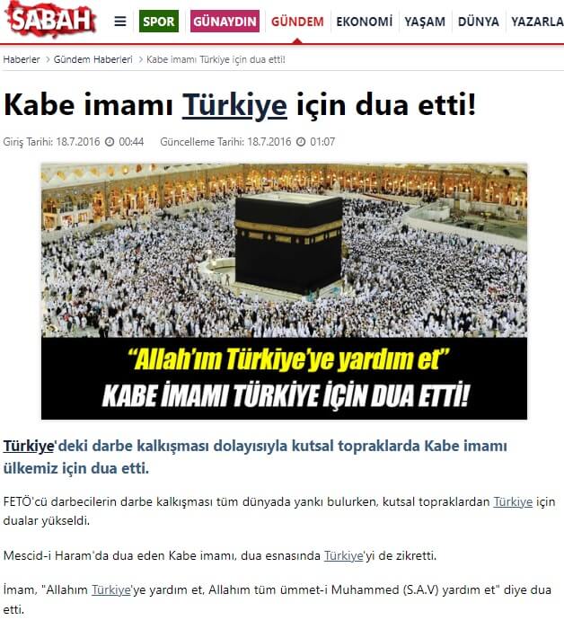 Kâbe’deki ibadet düzeninde, imamların toplu halde ve sesli dua ettikleri zamanlar ramazan geceleri, cuma namazları, yağmur duası namazları ve güneş-ay tutulması namazlarıdır. Kâbe’de bunun dışında açıktan dua uygulaması yoktur. Kâbe’deki bütün namazları canlı yayınlayan ve eski kayıtlara ulaşma imkânı da sunan www.haramain.info adlı sitede yapılacak ufak bir araştırma, 15 Temmuz ve sonrasında iddia edildiği gibi duanın hiç edilmediğini de gösterecektir.