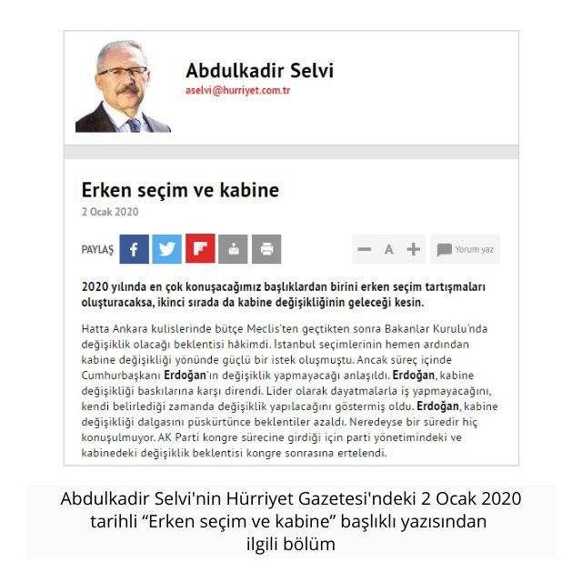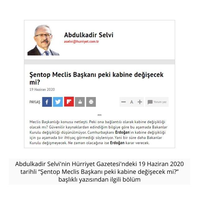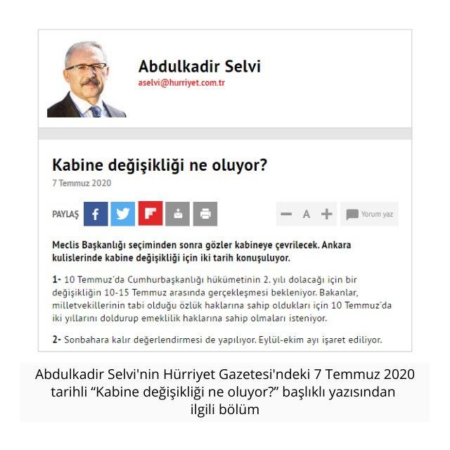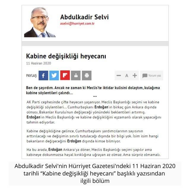 5 Haziran 2020 tarihli yazısında kabine değişikliği söylentilerinin kabak tadı vermeye başladığını, gündeme gelmeye çalışan gazetecilerin fantezisine dönüştüğünü söyleyen Selvi, aslında kabine değişikliği söylemini köşesine en çok taşıyan yazar.