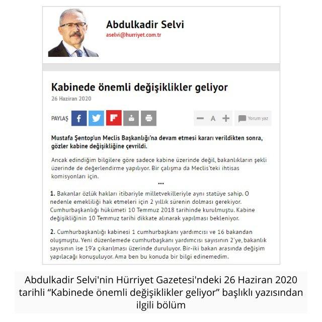 “Kabinede önemli değişiklikler geliyor” (26 Haziran 2020):
