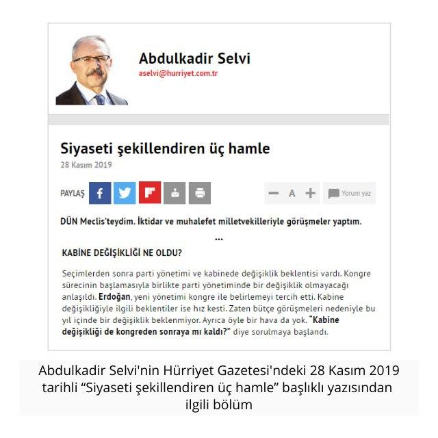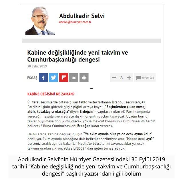 Selvi’nin kabine revizyonuna dair söylemlerindeki hızlı değişimler de dikkat çekici. Örneğin, 19 Haziran 2020 günü kabine değişikliği olmayacak derken, 26 Haziran 2020 günkü yazısında bakanlık sayısının artırılarak bazı bakanların değiştirileceğine değinmişti. 2 Eylül 2019’da 4-6 bakan yenilenecek derken, 9 Eylül 2019 tarihli yazısında değişikliğin 2-3 ay sonra olacağı sinyalini aldığını aktarıp, 10 Eylül günü Binali Yıldırım’ın birinci cumhurbaşkanı olarak kabineye gireceğini iddia etmişti.