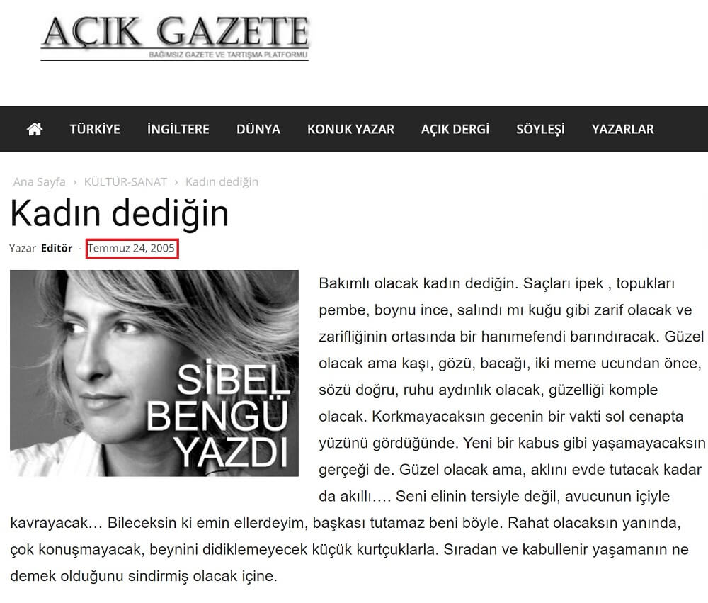 - İlk bakışta bir erkek tarafından yazıldığı algısı oluşturan bu mısralar, Sibel Bengü tarafından kaleme alınmış ve 24 Temmuz 2005 tarihinde Açık Gazete’de yayımlanmış. Sibel Bengü’nün kişisel internet günlüğünde de yer verdiği bu şiirin yanı sıra bir de “Adam Gibi Adam Dedikleri” versiyonu bulunuyor.