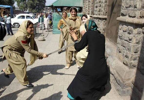 26 Eylül 2012 günü Hint polisinin göstericilere müdahale anında kaydedilen fotoğraflarda, bahsi geçen görseldeki şiddetin faili ve mağduru kadınlar görülebiliyor.