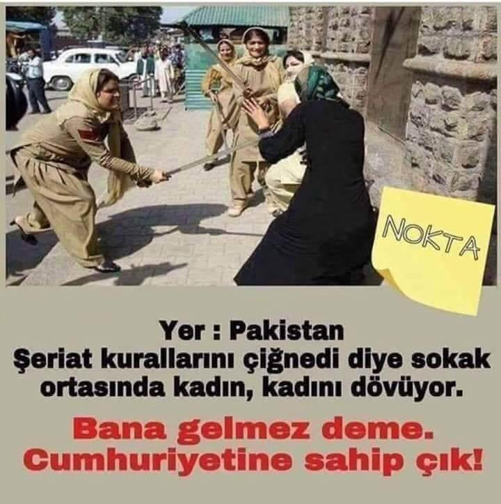Yer: Pakistan. Şeriat kurallarını çiğnedi diye sokak ortasında kadın, kadını dövüyor Bana gelmez deme. Cumhuriyetine sahip çık!” notuyla sosyal medyada paylaşılan fotoğraf şu şekilde: