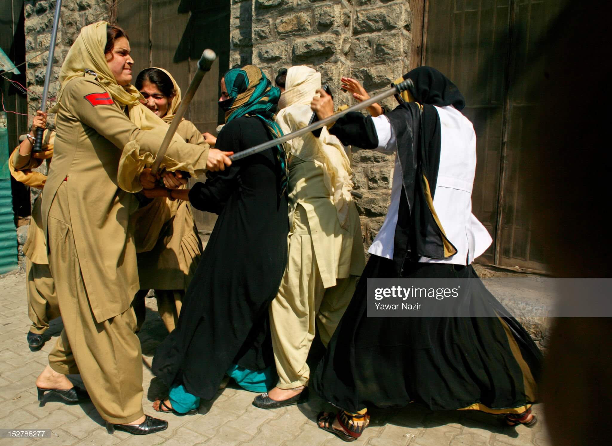 “SRINAGAR, KAŞMİR, HİNDİSTAN – 26 EYLÜL: Hintli polis kadınları, Hindistan’ın Keşmir, Hindistan’ın yazlık başkenti Srinagar’da 26 Eylül 2012’de sınav sonuçlarına karşı düzenlenen bir protesto sırasında sağlık görevlilerine cop sallayıp dövdüler. Hindistan polisinin kalabalığı coplarla dağıtmaya çalışması sonrasında bir düzineden fazla kadın sağlık görevlisi yaralandı. Grup, öğrencilerin yüzde 90’ının başarısız olduğu son sınav sonuçlarını protesto ediyordu. Öğrenciler, tıp eğitimi departmanının talebini reddettiği halde, cevap kağıtlarının kopyalarının kamuya açıklanmasını talep ettiler. (Fotoğraf: Yawar Nazir/Getty Images)”
