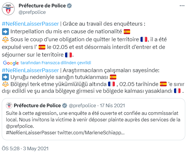 “Ulaşım güvenliğini sağlayan polis ekipleri, #LaChapelle’de bir kadına yönelik saldırının failini dünkü şikayeti üzerine bu sabah tutukladı. Bu hafta tanıştığımız acentelere büyük verimlilikleri için teşekkür ederiz!”
