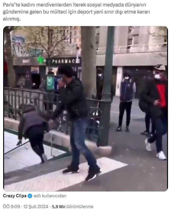 Serkan Tanyildizi (@srkntnyldz): “Paris’te kadını merdivenlerden iterek sosyal medyada dünyanın gündemine gelen bu mülteci için deport yani sınır dışı etme kararı alınmış.”