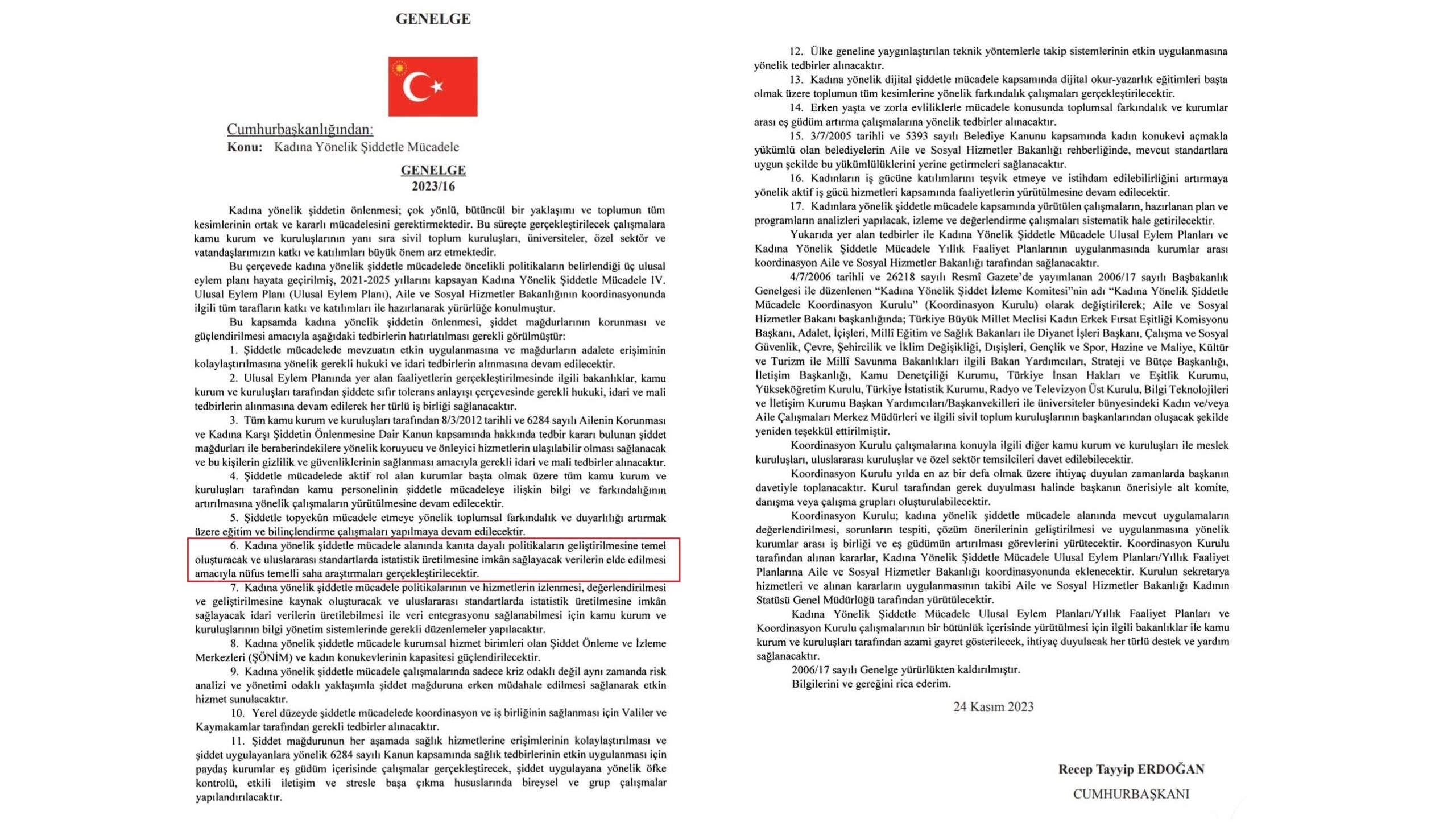 25 Kasım 2023 tarihli 32380 sayılı Resmî Gazete’de Cumhurbaşkanı Recep Tayyip Erdoğan imzalı “Kadına Yönelik Şiddetle Mücadele” konulu 2023/16 sayılı genelge yayımlandı.