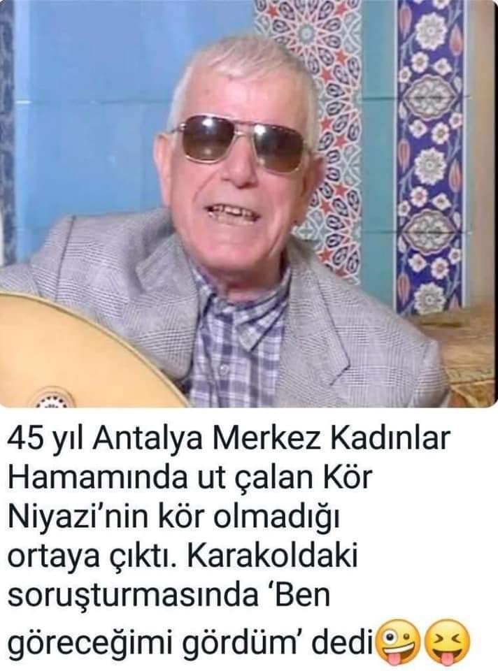 “45 yıl Antalya Merkez Kadınlar hamamında ut çalan Kör Niyazi’nin kör olmadığı ortaya çıktı. Karakoldaki soruşturmasında “Ben göreceğimi gördüm” dedi 😂😂😂😂 🤭”