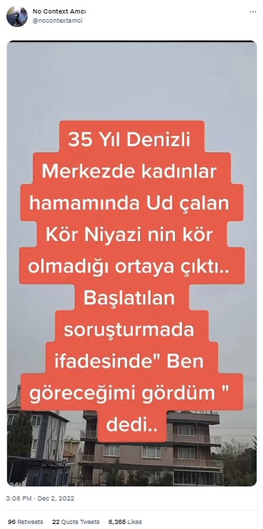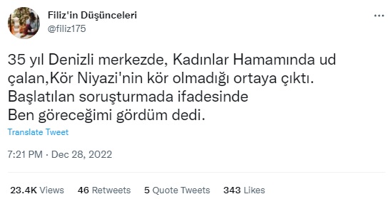 “35 yıl Denizli merkezde, Kadınlar Hamamında ud çalan, Kör Niyazi’nin kör olmadığı ortaya çıktı. Başlatılan soruşturmada ifadesinde Ben göreceğimi gördüm dedi.”