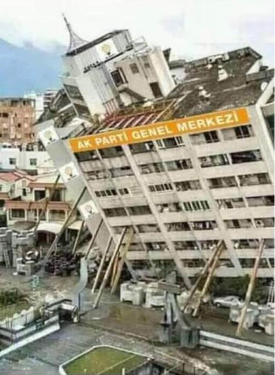 Sosyal medyada paylaşılan AK Parti Genel Merkezi tabelalı yan yatmış bina görselinin orijinali Tayvan’da 7 Şubat 2018 günü meydana gelen 6,5 büyüklüğündeki depremin ardından kaydedilmiş.