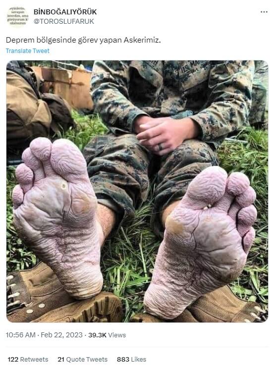 Ayakları su toplamış asker fotoğrafı, iddia olunanın aksine deprem bölgesinde görev yapan Mehmetçiğe ait değil. Eski tarihli görseldeki üniformadaki isimlikteki “US Marines” ifadesi, ayakların ABD Deniz Kuvvetlerinden bir askere ait olduğunu işaret ediyor.