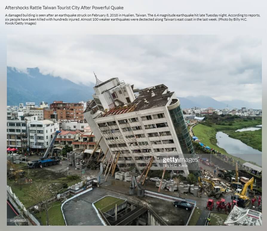 “Tayvan’ın Hualien kentinde 8 Şubat 2018’de meydana gelen depremin ardından hasarlı bir bina görülüyor. 6.4 büyüklüğünde deprem Salı gecesi geç saatlerde meydana geldi. Edinilen bilgilere göre 6 kişi hayatını kaybederken yüzlerce kişi de yaralandı. Geçen hafta Tayvan’ın doğu kıyısı boyunca yaklaşık 100 daha zayıf deprem tespit edildi. (Fotoğraf: Billy HC Kwok/Getty Images)”