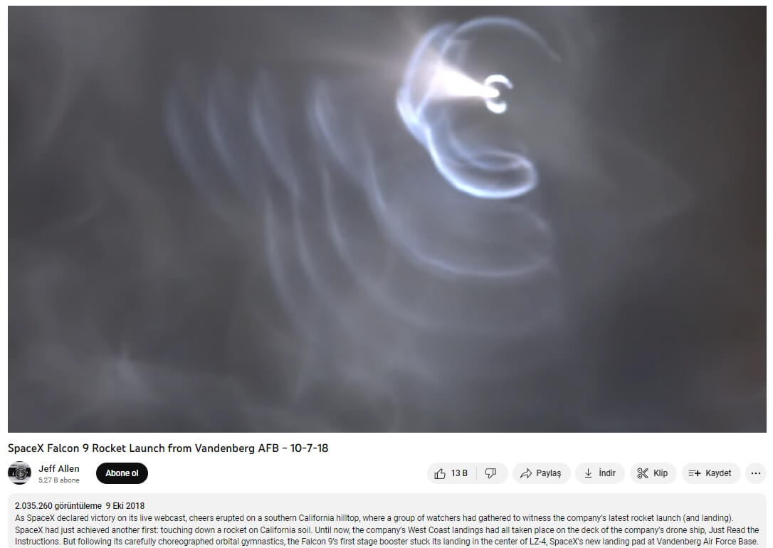 Yine ülkemizde meydana gelen depremlerle ilişkilendirilerek paylaşılan, gökyüzünde bir ışık kaynağı etrafında dalgaların görüntülendiği bir diğer videoda da 7 Ekim 2018 günü fırlatılan SpaceX Falcon roketi görülüyor.