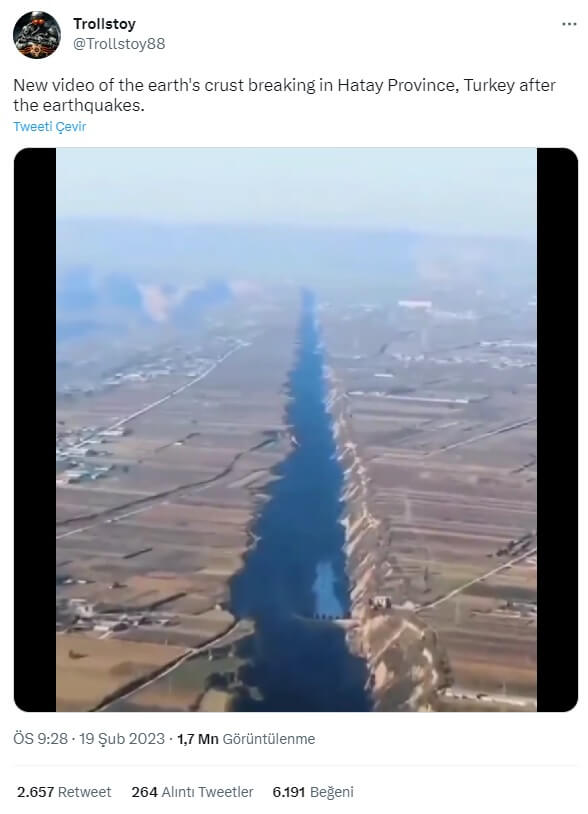 Çin Halk Cumhuriyeti’nin Shanxi (Şansi) eyaletindeki Yuncheng kentindeki Pinglu ilçesinde bulunan ovadaki 10 kilometrelik yer yarığına ait görüntü, Hatay’da depremin ardından kaydedildiği iddiasıyla aktarılmış.