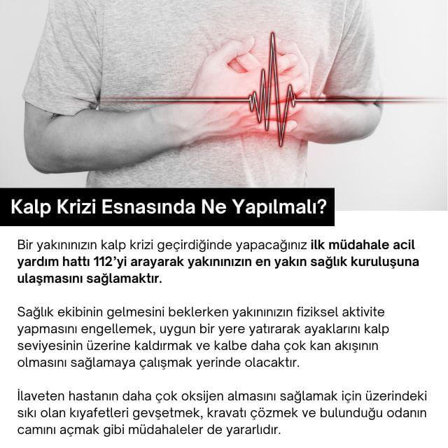“Bir yakınınızın kalp krizi geçirdiğini anladığınızda ise yapacağınız ilk müdahale en kısa zamanda acil yardım hattı olan 112’yi arayarak yakınınızın en yakın sağlık kuruluşuna ulaşmasını sağlamaktır. Sağlık ekibinin gelmesini beklerken ise yakınınızın fiziksel aktivite yapmasını engellemek, uygun bir yere yatırarak ayaklarını kalp seviyesinin üzerine kaldırmak ve kalbe daha çok kan akışının olmasını sağlamaya çalışmak yerinde olacaktır. İlaveten hastanın daha çok oksijen almasını sağlamak için üzerindeki sıkı olan kıyafetleri gevşetmek, kravatı çözmek ve bulunduğu odanın camını açmak gibi müdahaleler de yararlıdır.”