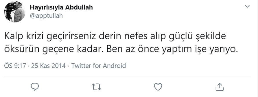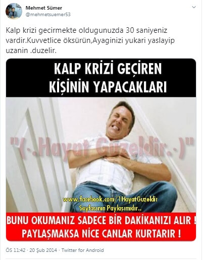 Türk Kalp Vakfı’ndan Doç. Dr. Emrah Binak, vakfın internet sitesinde yazdığı yazıda, kalp krizinin erken tanı ve tedavisinin çok önemli olduğunu söyleyerek hastanın en kısa sürede hastaneye götürülmesinin hayat kurtarıcı olduğuna değinmişti.