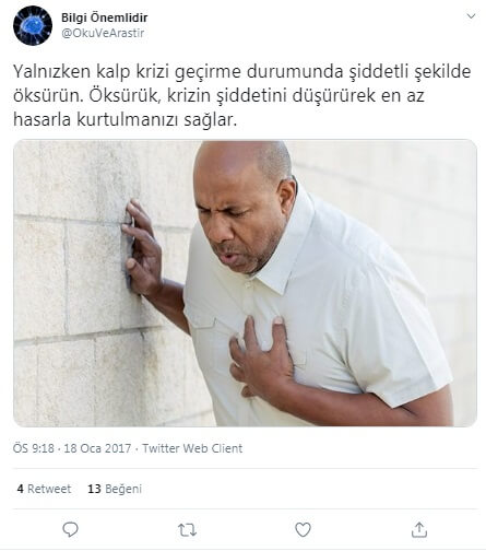 Sosyal medyada yapılan bir anahtar kelime taraması, kalp krizi geçirildiği anda öksürmek gerektiğine yönelik yanlış algının bir hayli yaygın olduğunu ortaya koyuyor.