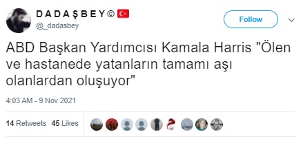 ABD Başkan Yardımcısı Kamala Harris’in ABD’de Ölen ve Hastanede Yatanların Tamamının Covid-19 Aşısı Olduğunu Söylediği İddiası Doğru Değil