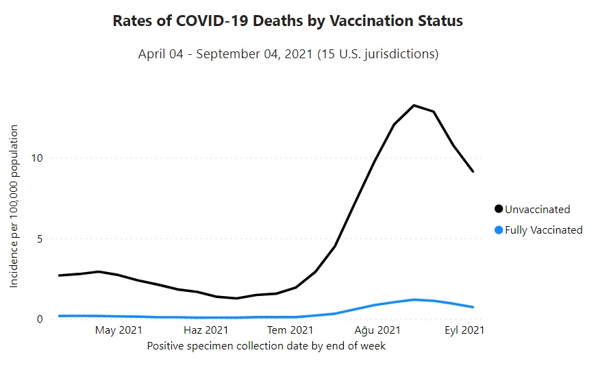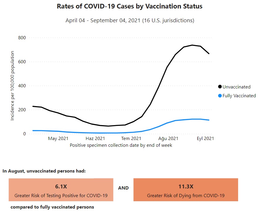 CDC’nin açıkladığı verilere göre aşılanmamış kişiler tam aşılılara kıyasla Covid-19 nedeniyle yaşamını yitirmeleri 11,3 kat, Covid-19 testinin pozitif çıkması 6,1 kat daha yüksek riske sahip.