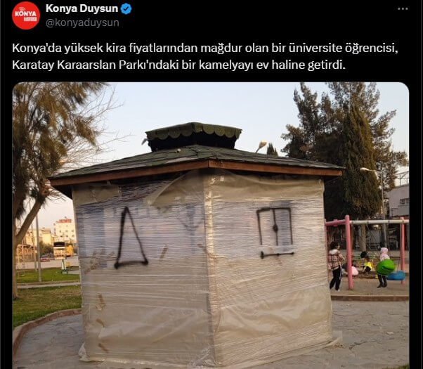 Bu süreçte, Konya’da yüksek kira fiyatlarından mağdur olan bir üniversite öğrencisinin Karatay Karaarslan Parkı’ndaki bir kameriyeyi naylon poşet ile ev haline getirdiği ileri sürüldü.
