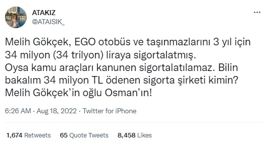 “Melih Gökçek, EGO otobüs ve taşınmazlarını 3 yıl için 34 milyon (34 trilyon) liraya sigortalatmış. Oysa kamu araçları kanunen sigortalatılamaz. Bilin bakalım 34 milyon TL ödenen sigorta şirketi kimin? Melih Gökçek’in oğlu Osman’ın!”