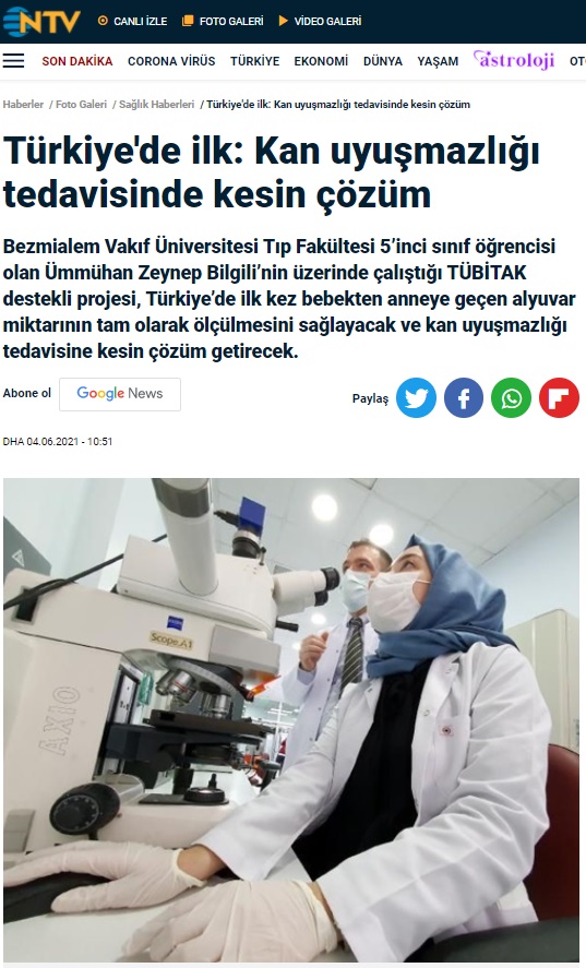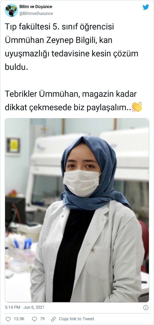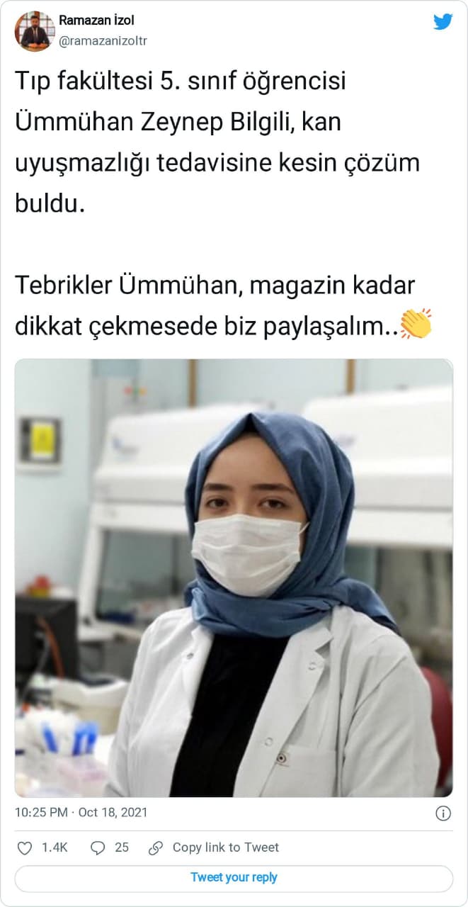 “Tıp fakültesi 5. sınıf öğrencisi Ümmühan Zeynep Bilgili, kan uyuşmazlığı tedavisine kesin çözüm buldu. Tebrikler Ümmühan, magazin kadar dikkat çekmese de biz paylaşalım..”