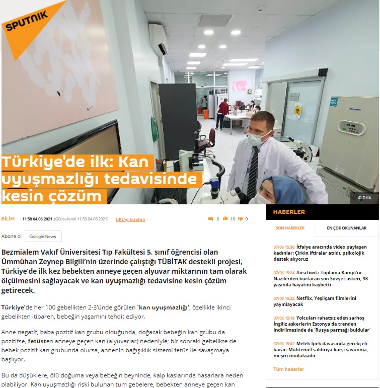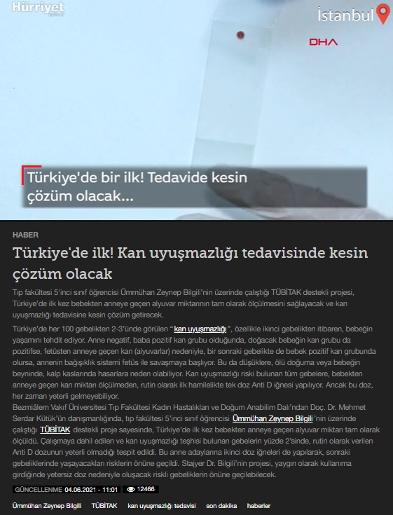 Bezmiâlem Vakıf Üniversitesi Tıp Fakültesi Kadın Hastalıkları ve Doğum Anabilim Dalı’ndan Doç. Dr. Mehmet Serdar Kütük’ün danışmanlığında, tıp fakültesi 5’inci sınıf öğrencisi Ümmühan Zeynep Bilgili’nin üzerinde çalıştığı TÜBİTAK destekli proje sayesinde, Türkiye’de ilk kez bebekten anneye geçen alyuvar miktarı tam olarak ölçüldü. Çalışmaya dahil edilen ve kan uyuşmazlığı teşhisi bulunan gebelerin yüzde 2’sinde, rutin olarak verilen Anti D dozunun yeterli olmadığı tespit edildi. Bu anne adaylarına ikinci doz iğneleri de yapılarak, sonraki gebeliklerinde yaşayacakları risklerin önüne geçildi. Stajyer Dr. Bilgili’nin projesi, yaygın olarak kullanıma girdiğinde yetersiz doz nedeniyle oluşacak riskli gebeliklerin önüne geçilebilecek.