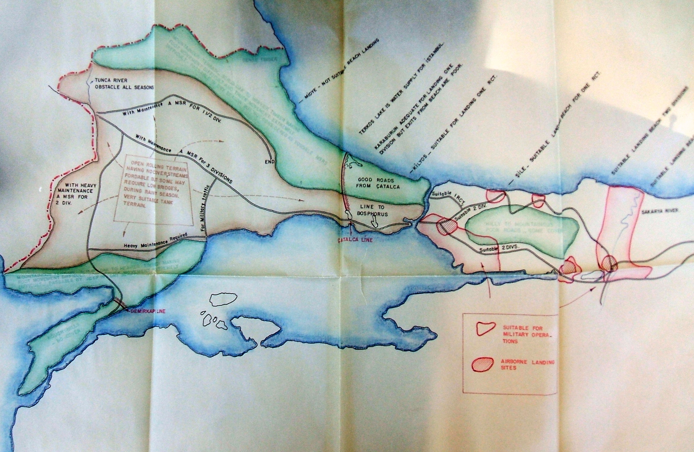 Haritaya ilişkin diğer görseller incelendiğinde II. Balkan Savaşı yıllarında bölgedeki ünlü savunma hattı Çatalca Hattının ve uygun hava indirme sahalarının işaretlenmiş olduğu görülmektedir.